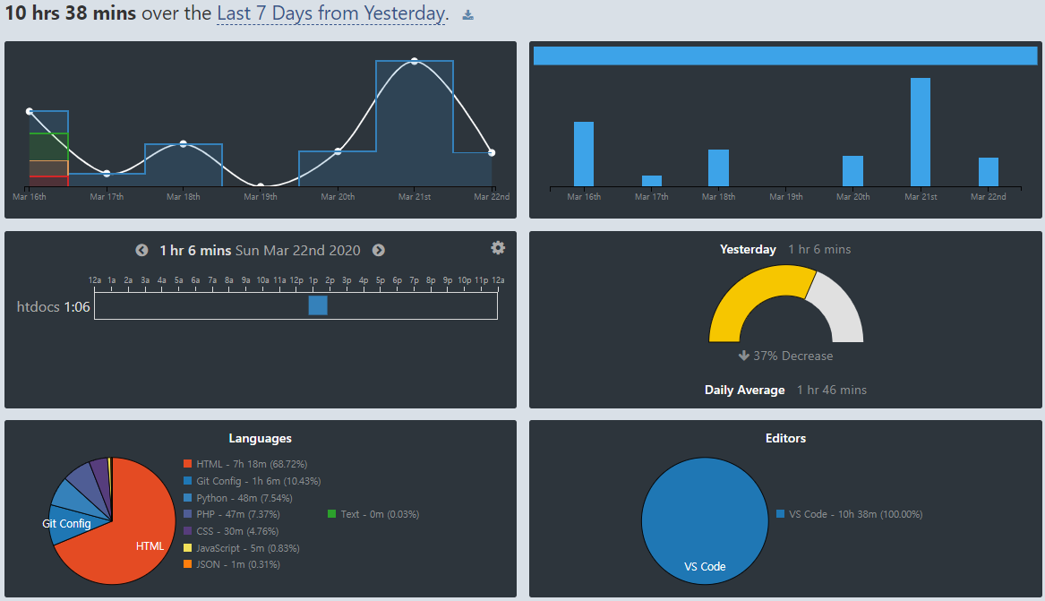 | [WakaTime]Week 2 of March(20.03.09 ~ 20.03.15) (0) | 2020.03.17 |