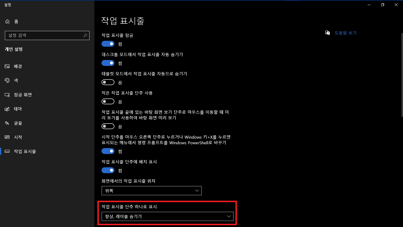 작업 표시줄 단추 하나로 표시 > 항상, 레이블 숨기기