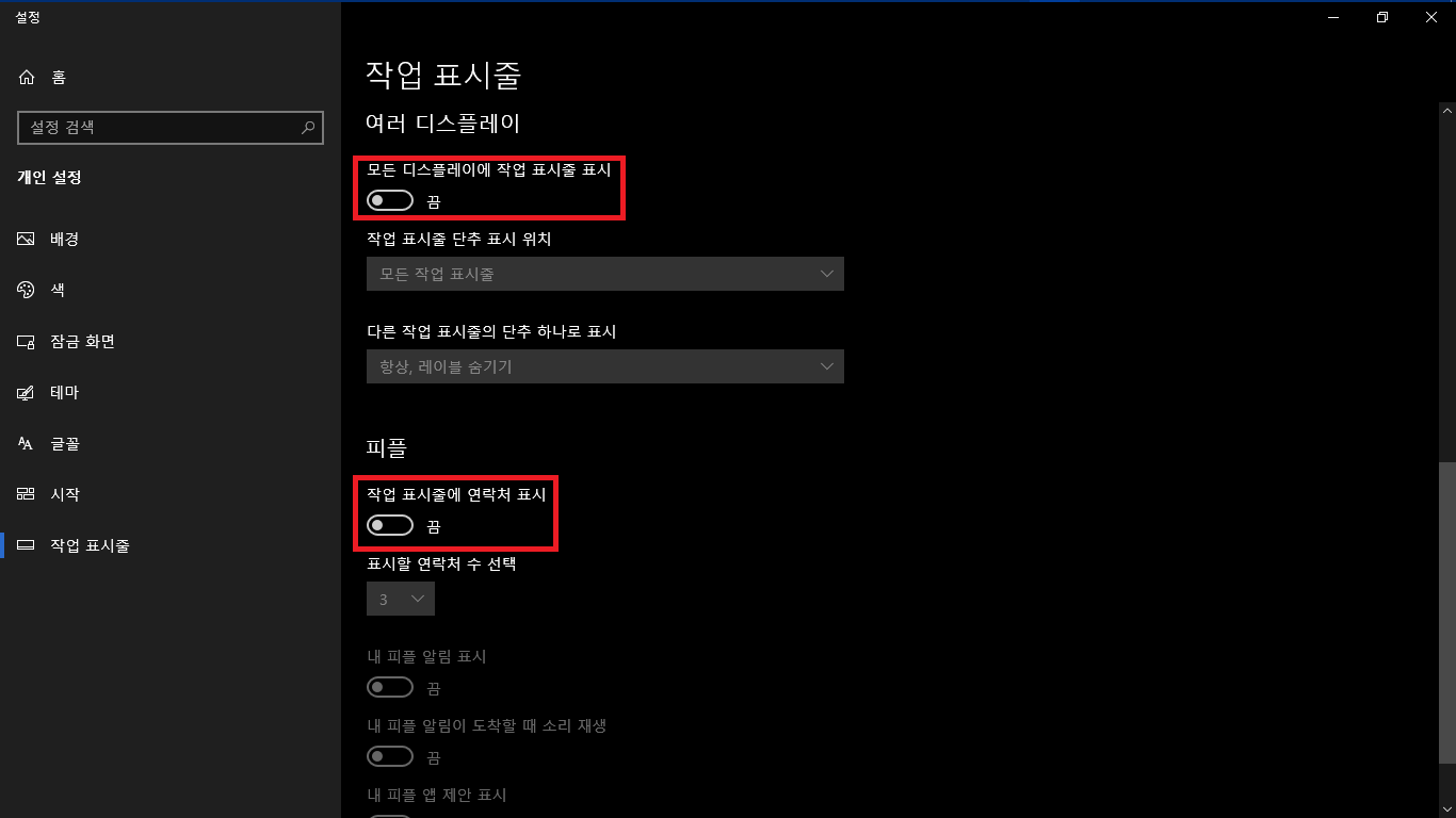 모든 디스플레이에 작업 표시줄 표시 > 끔