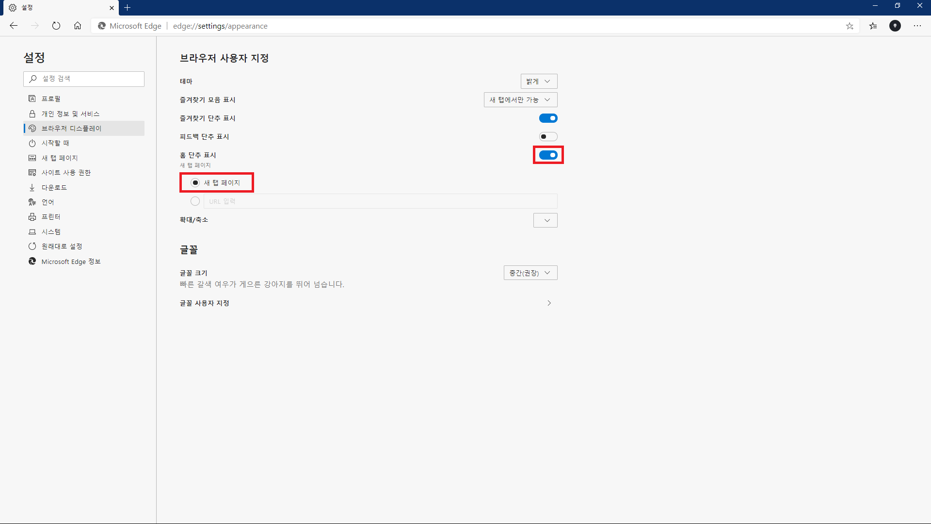 브라우저 디스플레이 > 홈 단추 표시 > 새 탭 페이지