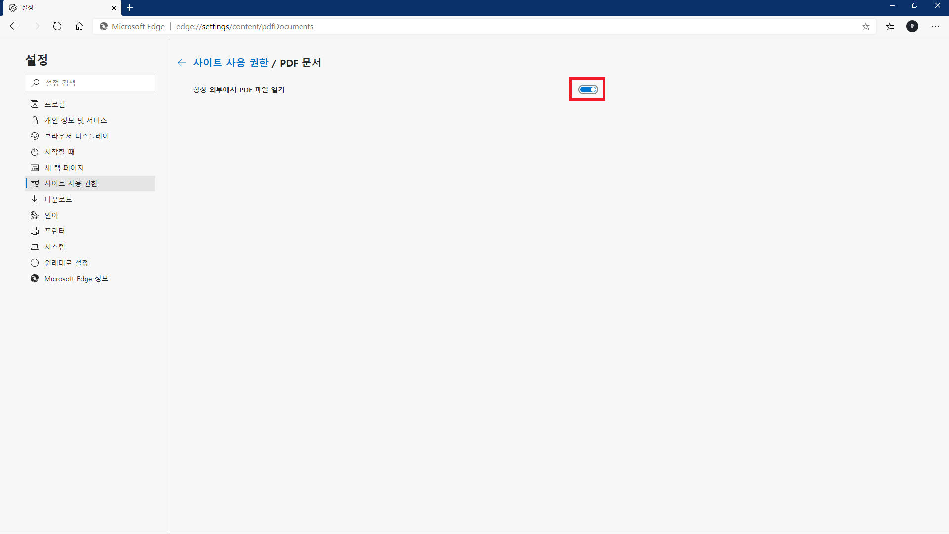 항상 외부에서 PDF 파일 열기 > 체크