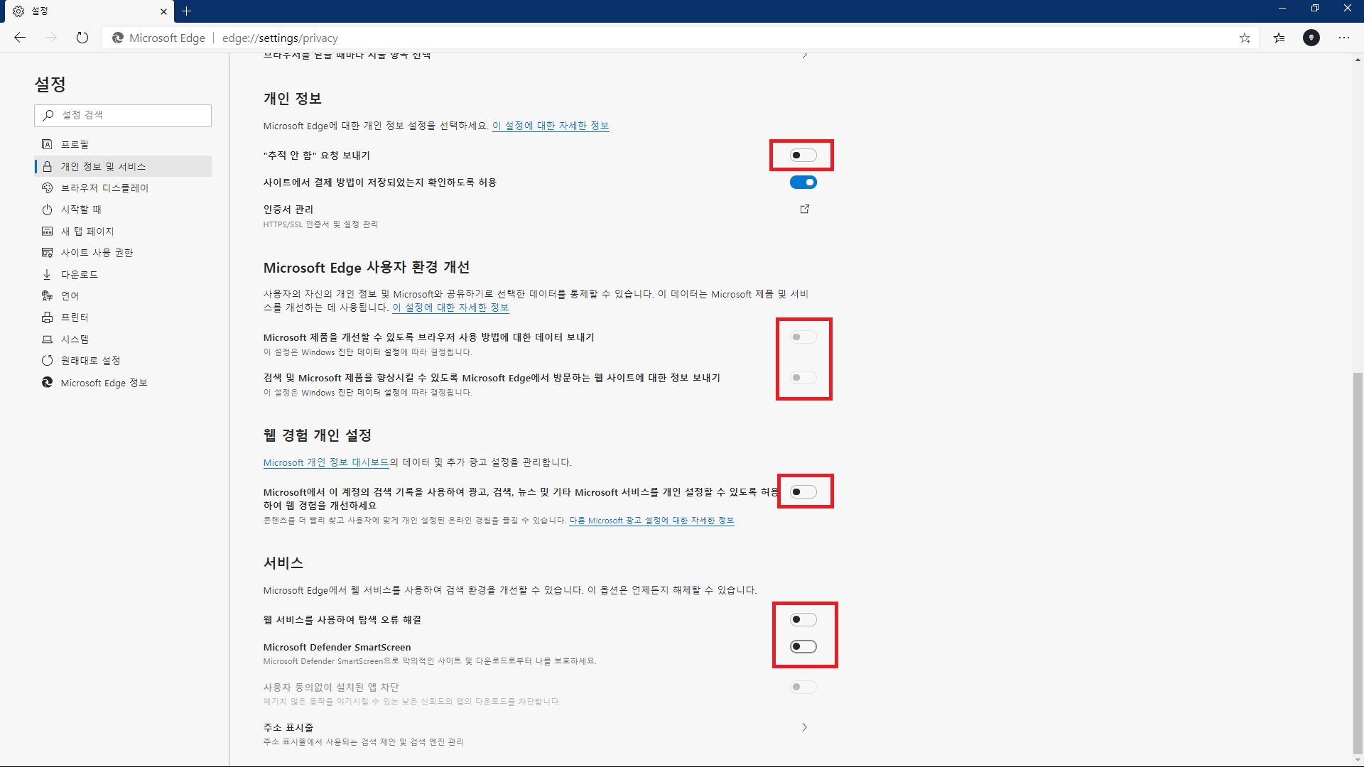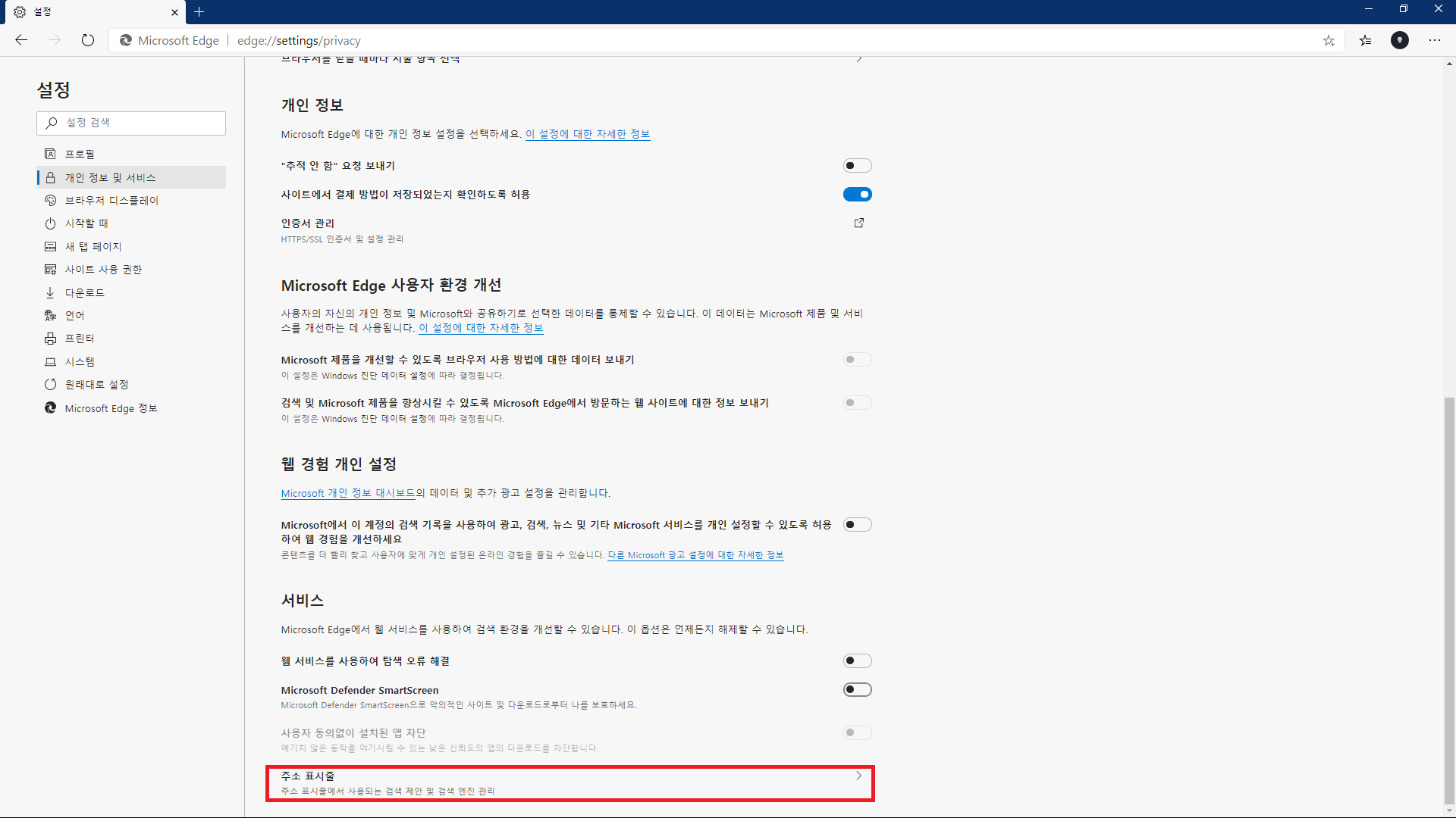 개인 정보 및 서비스 > 아래 내용 확인
