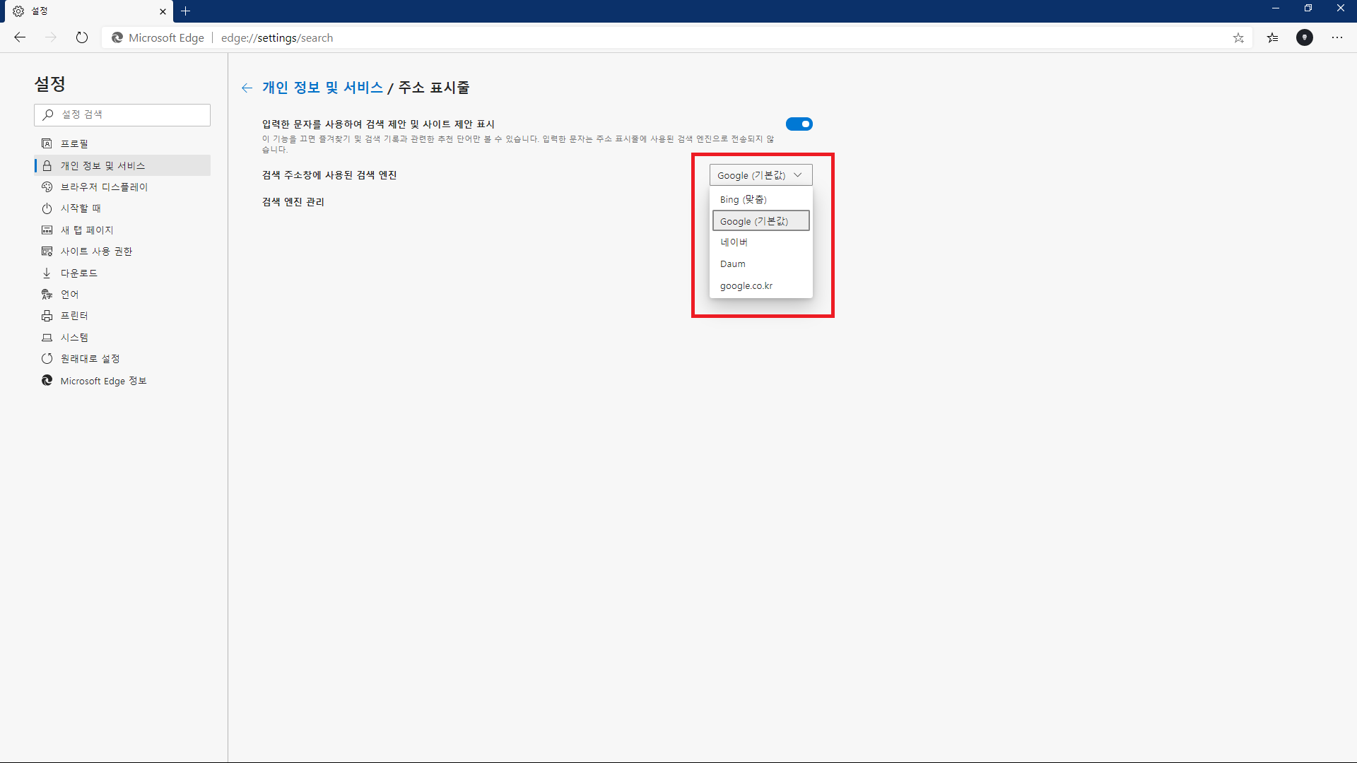 원하는 검색엔진 선택