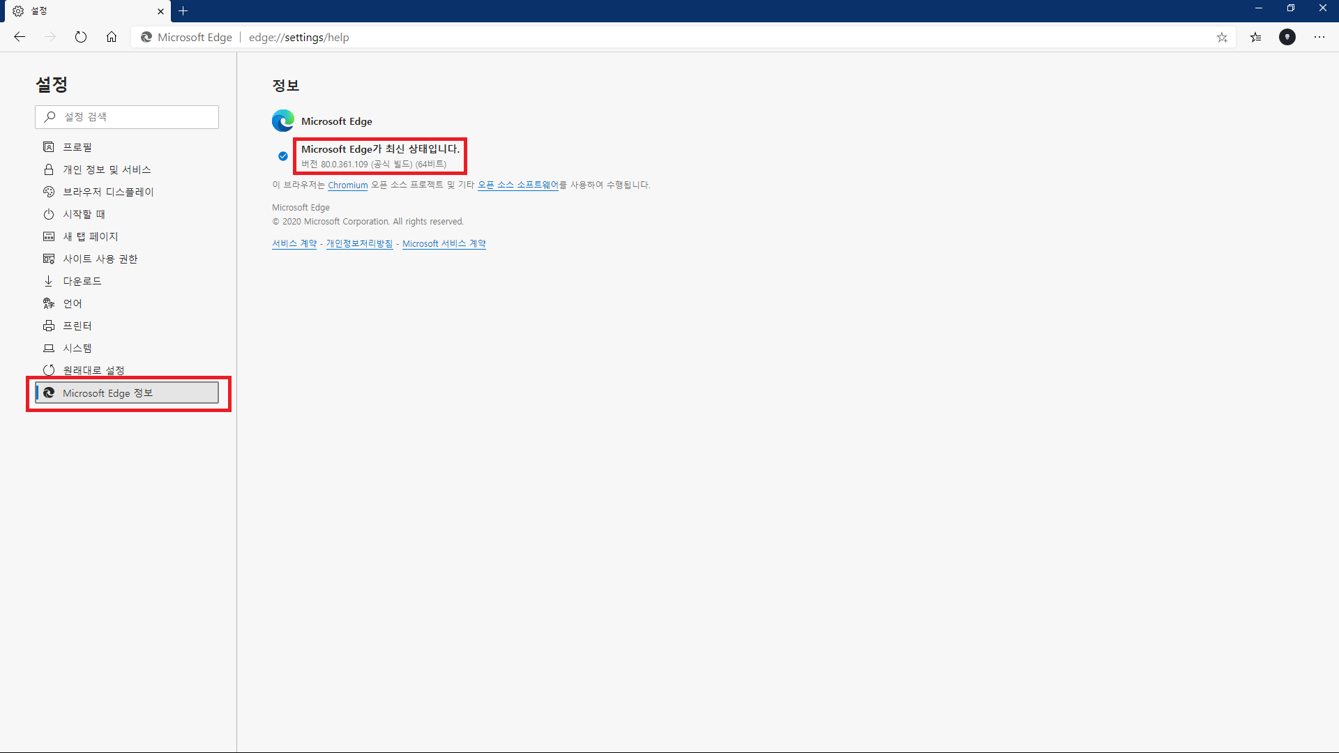 Microsoft Edge 정보 > 업데이트 확인