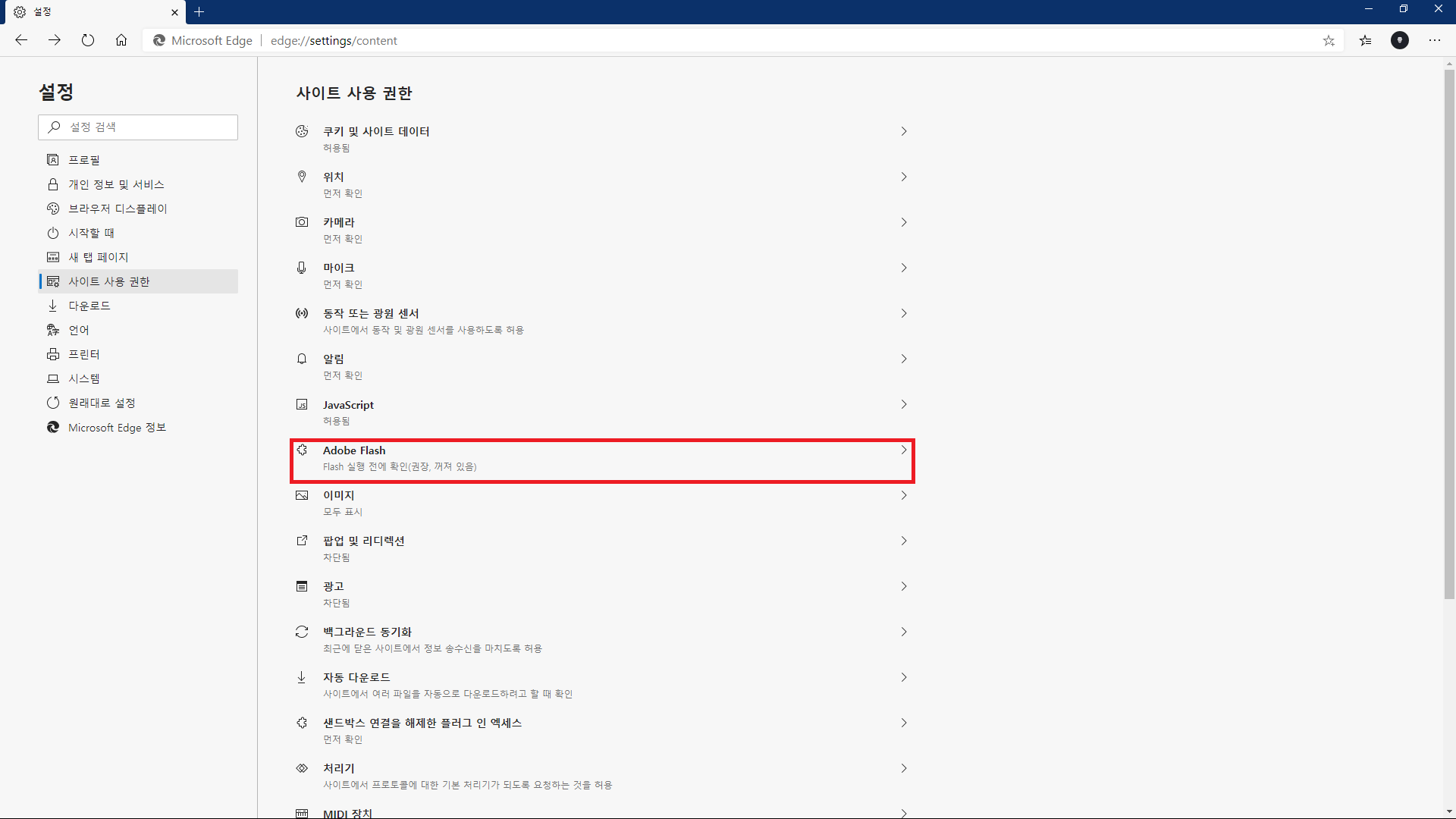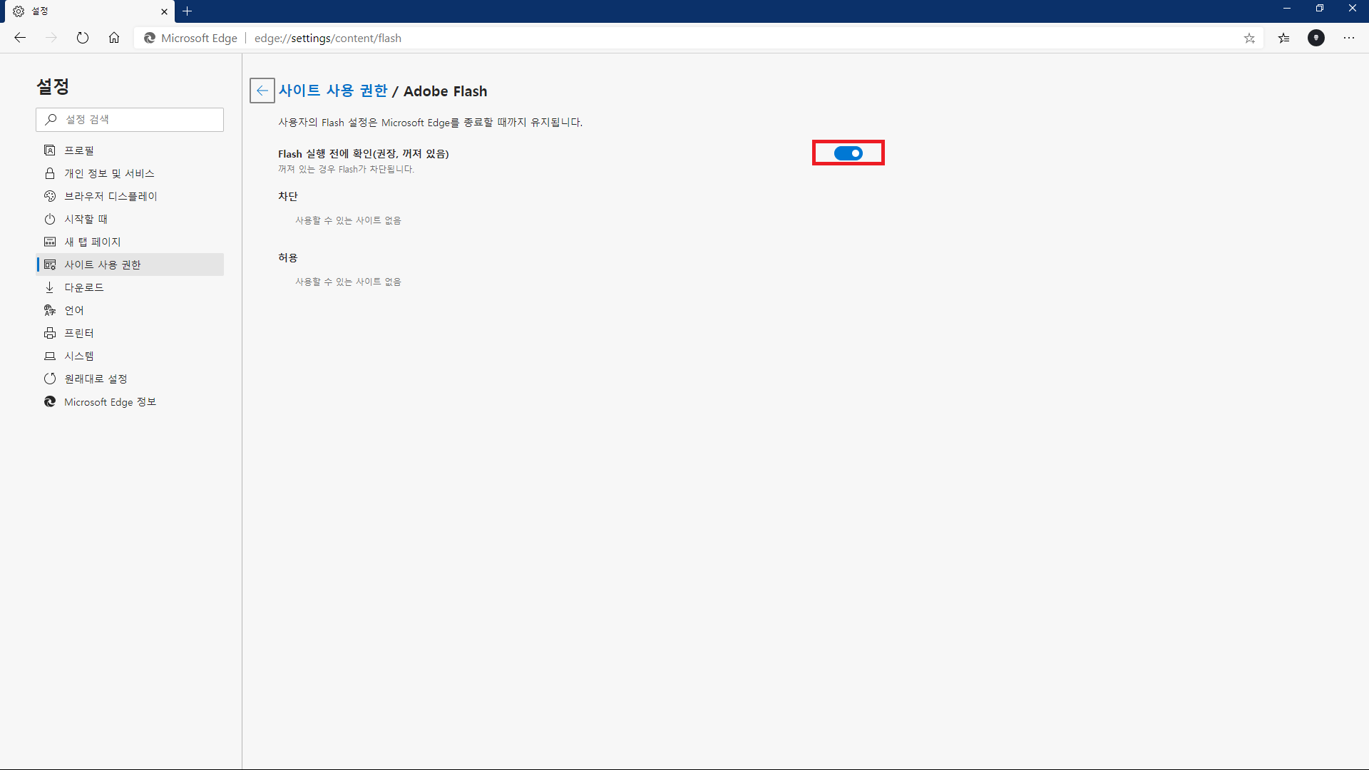 사이트 사용 권한 > Adobe Flash