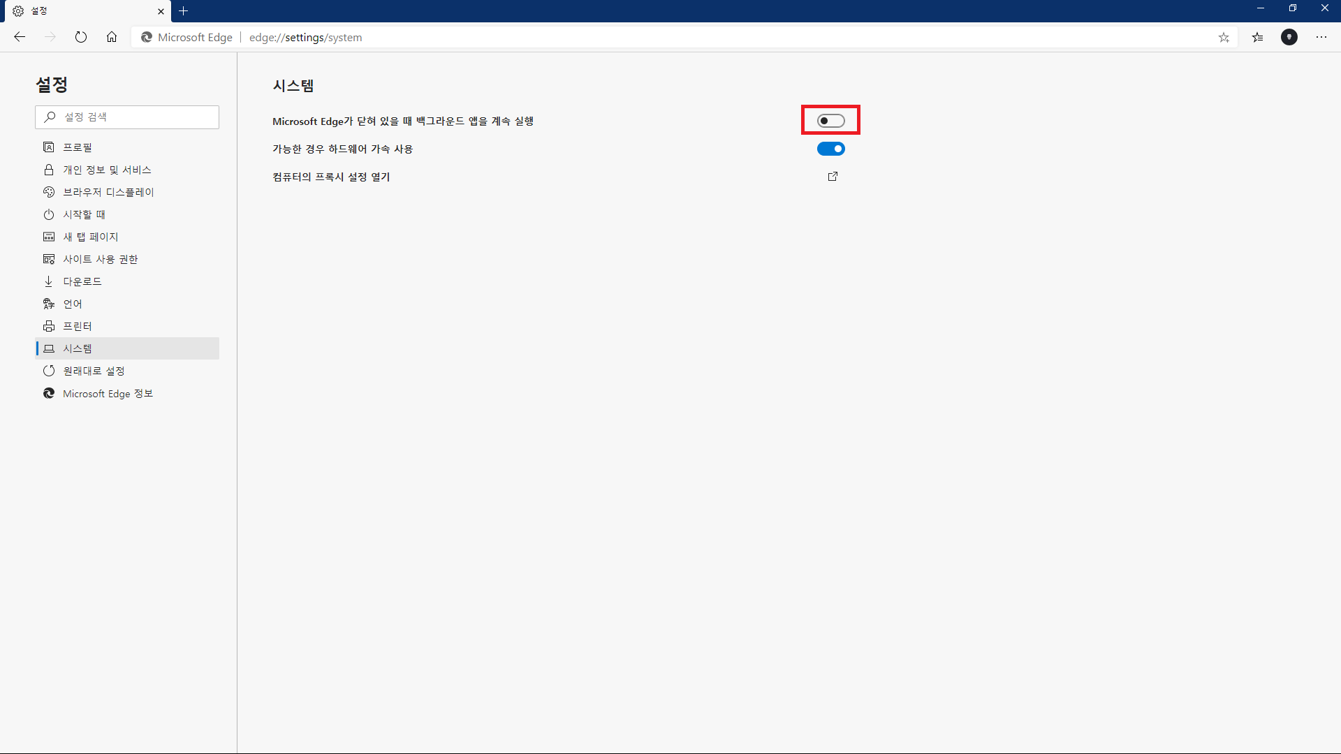 시스템 > Microsoft Edge가 닫혀 있을 때 백그라운드 앱을 계속 실행 > 해제