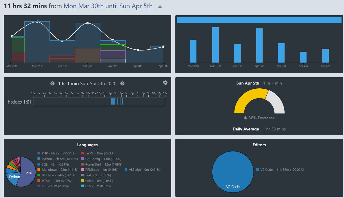 | [WakaTime]Week 4 of March(20.03.23 ~ 20.03.29) (0) | 2020.03.29 |