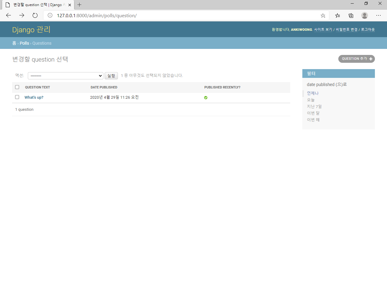 11. was_published_recently에 대한 열 머리글은 기본적으로 메서드 이름 (밑줄을 공백으로 대체)이며