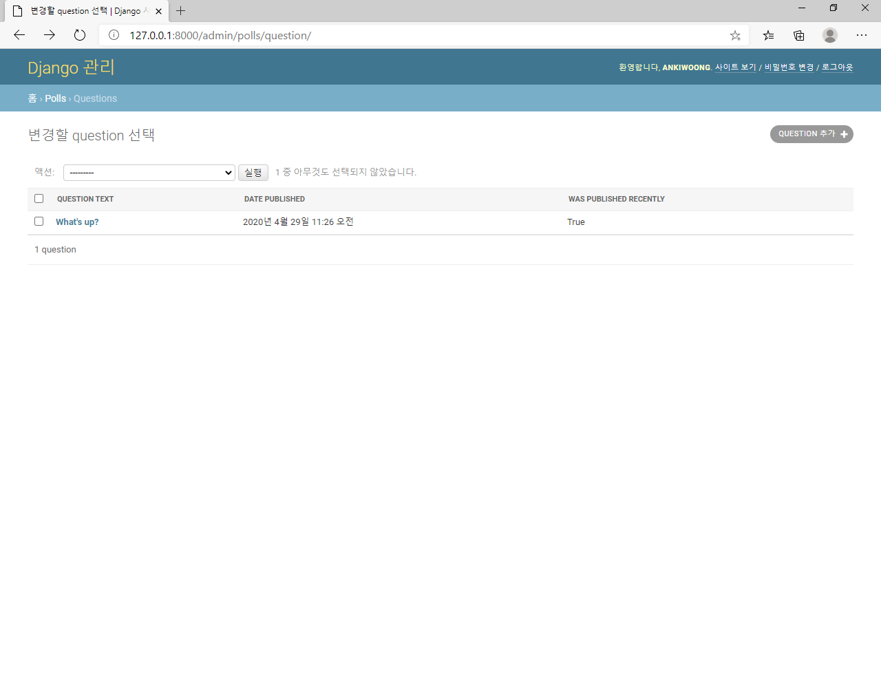 | [Django]Survey WEB Application Tutorial 5 (0) | 2020.04.30 |