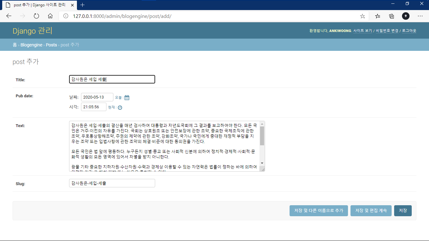 - 관리자 페이지에서 제목 입력시 자동으로 slug 입력 확인(한글)