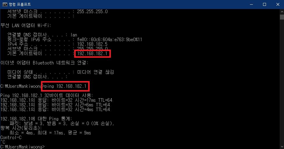 3. IPCONFIG /ALL 명령어 실행 후 무선 와이파이 기본 게이트 웨이 확인
