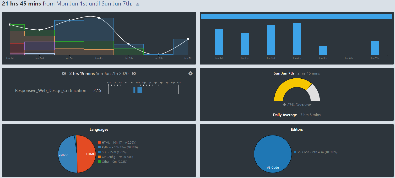 | [WakaTime]Week 3 of Jun(20.06.15 ~ 20.06.21) (0) | 2020.06.27 |