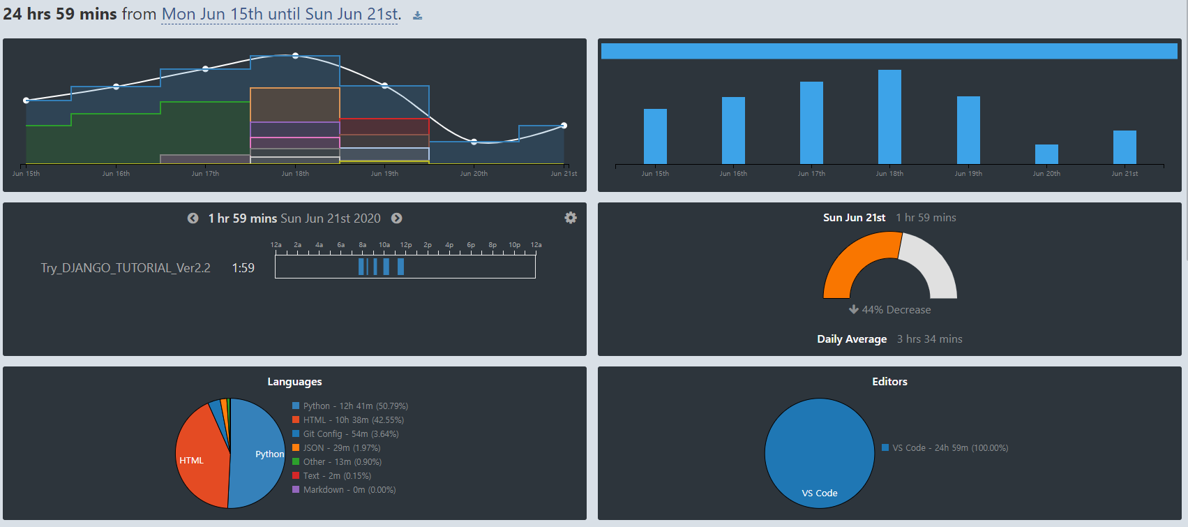 | [WakaTime]Week 1 of Jun(20.06.01 ~ 20.06.07) (0) | 2020.06.09 |