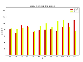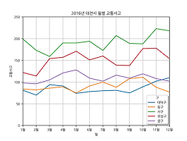 1. 그래프 단계(셀로판지 개념)1단계 : 배경 설정(축)2단계 : 그래프 추가(점, 막대, 선)3단계 : 설정 추가(축 범위, 색, 표식) 2. Sample Data BaseDaedeok = [81, 70, 94, 91, 74, 78, 80, 81, 75, 89, 102, 110] Donggu = [84, 82, 86, 89, 75, 91, 100, 88, 108, 111, 88, 77] Seogu = [199, 173, 159, 190, 190, 194, 173, 207, 189, 188, 223, 218] Yuseong = [122, 114, 154, 157, 171, 151, 160, 139, 138, 177, 178, 154] Junggu = [98, 96, 105, 121, 128, 109, ..