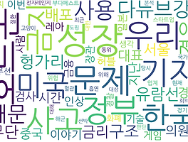 - Import Modulefrom Crawler import crawler from wordcloud import WordCloud from matplotlib import pyplot from collections import Counter from konlpy.tag import Okt import datetime as dt - Korea News Keyword Wordcloud현재 뉴스에서 많이 사용중인 키워드 분석 시각화 모듈WordCloud를 활용하여 시각화190531 키워드 분석 시각화 - 현재 키워드 : 갯수 '성장': 56, '호르몬': 53, '문제': 48, '정부': 42, '기자': 42, '우리': 41, '사고': 40, '한국': 38, '미국': 35, '금지': 34, '..