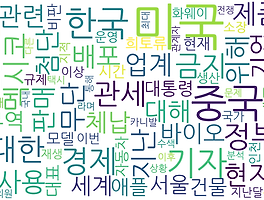 - Import Modulefrom Crawler import crawler from wordcloud import WordCloud from matplotlib import pyplot from collections import Counter from konlpy.tag import Okt import datetime as dt - Korea News Keyword Wordcloud현재 뉴스에서 많이 사용중인 키워드 분석 시각화 모듈WordCloud를 활용하여 시각화190605 키워드 분석 시각화 - 현재 키워드 : 갯수 '미국': 105, '중국': 59, '한국': 45, '기자': 41, '경제': 35, '정부': 34, '대한': 34, '관세': 31, '멕시코': 30, '금지': 29, ..